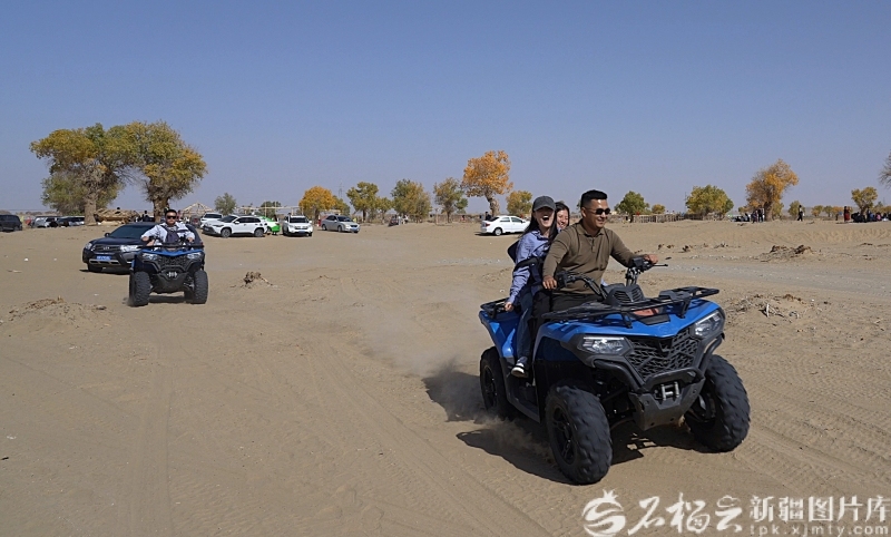 游客驾驶越野摩托车,驰骋于沙漠之中,欣赏壮观景色与金黄胡杨林。阿不都拉·买买提明 摄